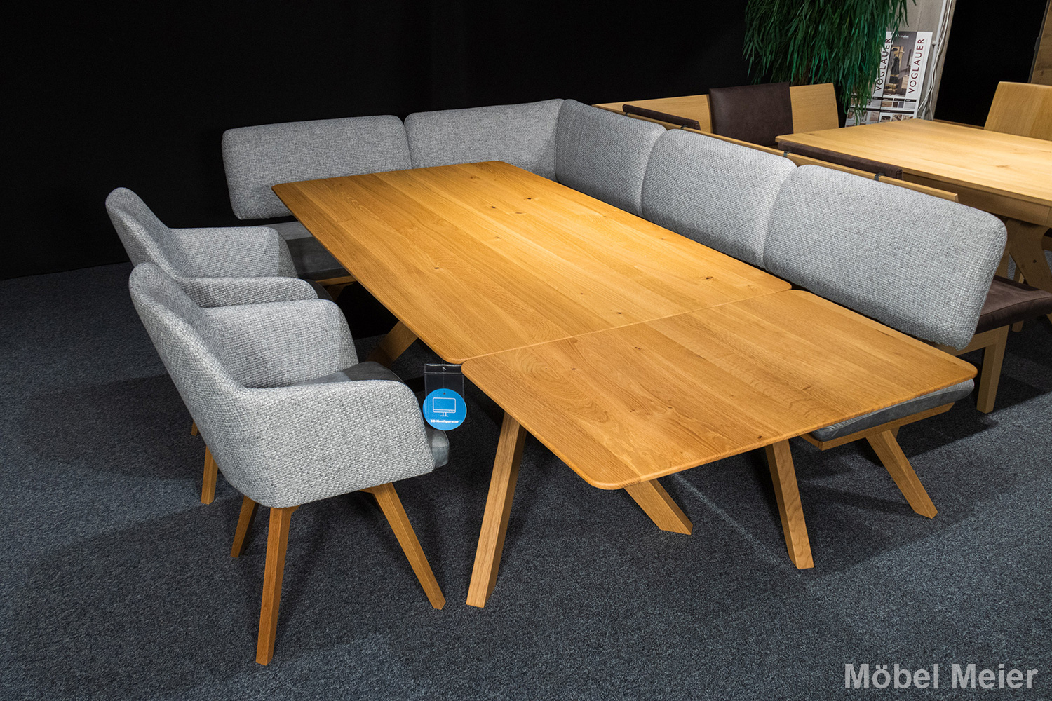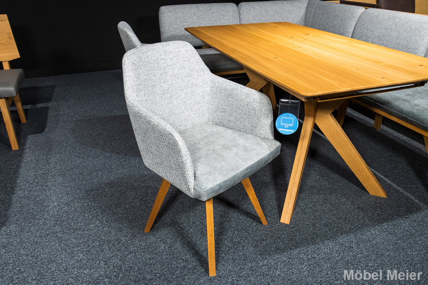 Die schrägen Holzfüsse sowohl der Bank als auch des Tisches unterstreichen das moderne Design und sorgen für eine robuste Standfestigkeit. Kombiniert mit den Stühlen Mod. CAS51 in Wildeiche, die für zusätzlichen Komfort eine Drehfunktion bieten, ergibt sich ein harmonisches Bild, das Flexibilität und Funktionalität gleichermassen bietet.