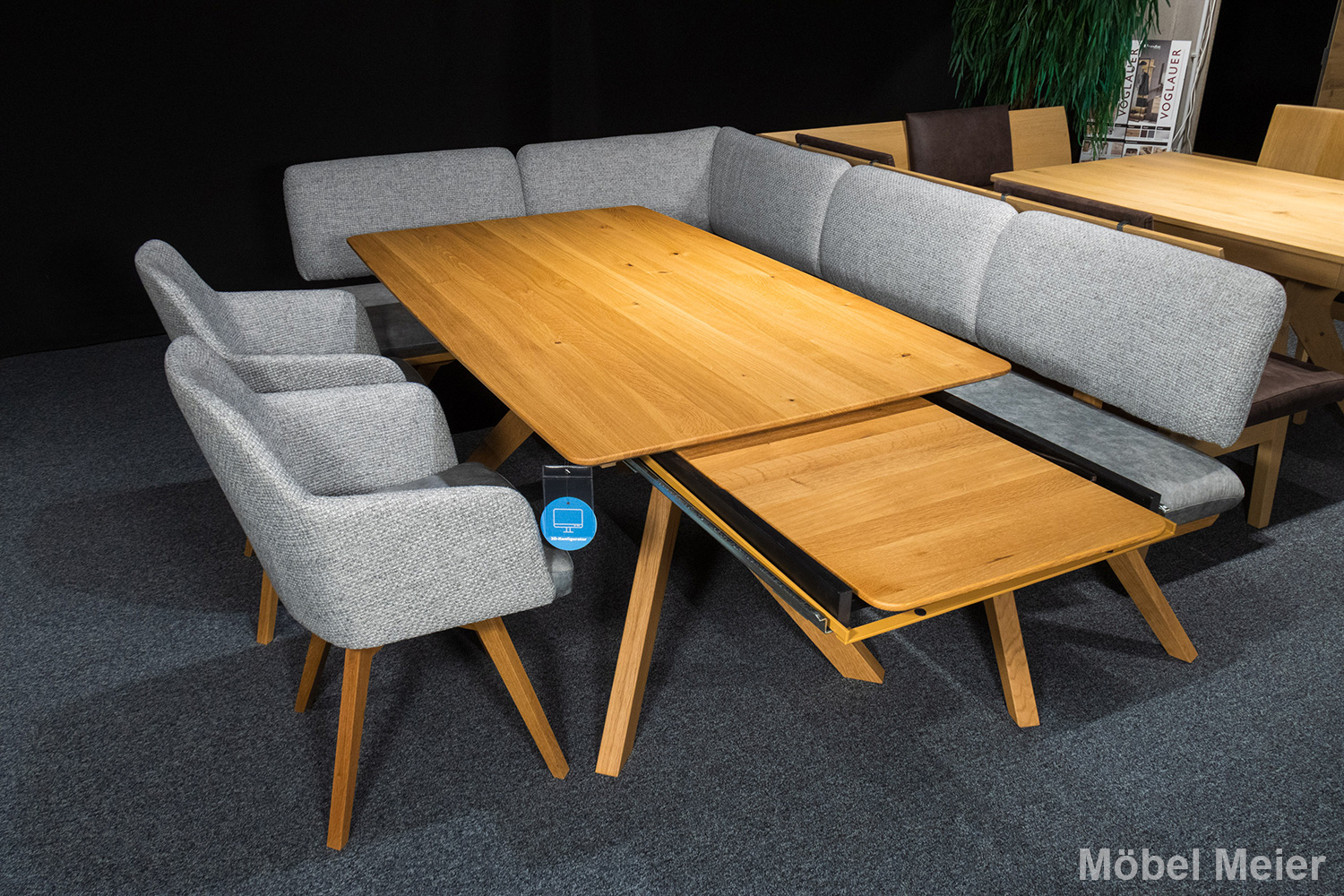 Zu dieser eindrucksvollen Eckbank gehört der Tisch Caracas, der mit seiner massiven, sanft geölten Asteichenplatte überzeugt. Der Tisch bietet genug Platz für gesellige Abende und kann dank der Einhanddreh-Auszugsfunktion bei Bedarf erweitert werden, um noch mehr Gäste willkommen zu heissen.