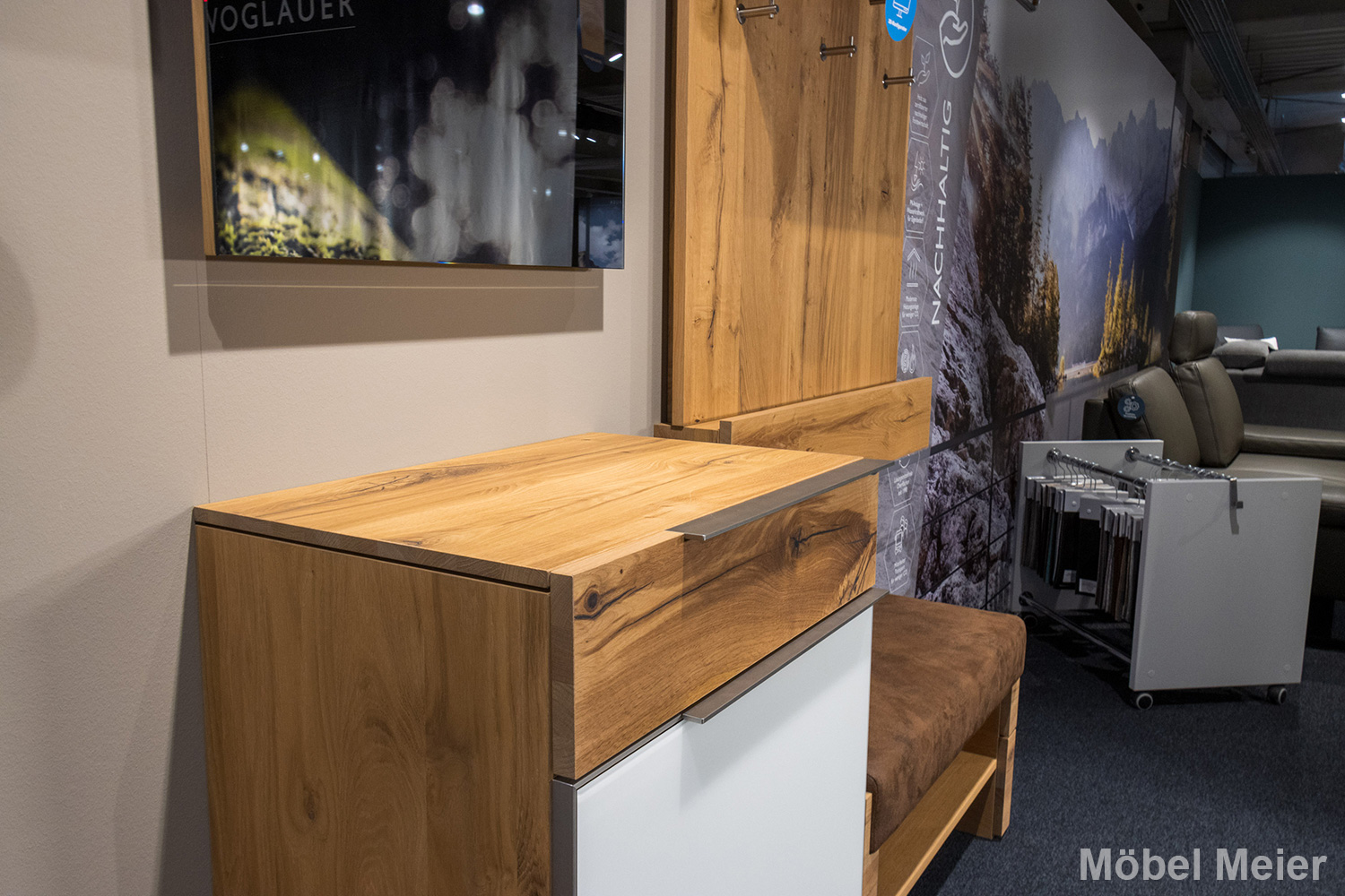 Die Garderobe Voglauer Valpin verleiht jedem Eingangsbereich ein gemütliches und stilvolles Ambiente. Aus hochwertiger Eiche Altholz gefertigt und mit Akzenten aus Colorglas optiwhite verfeinert, verkörpert dieses Möbelprogramm zeitlose Eleganz und natürliche Schönheit. Die Kombination aus robustem Holz und glattem Glas schafft eine harmonische Balance, die sowohl funktional als auch ästhetisch ansprechend ist.