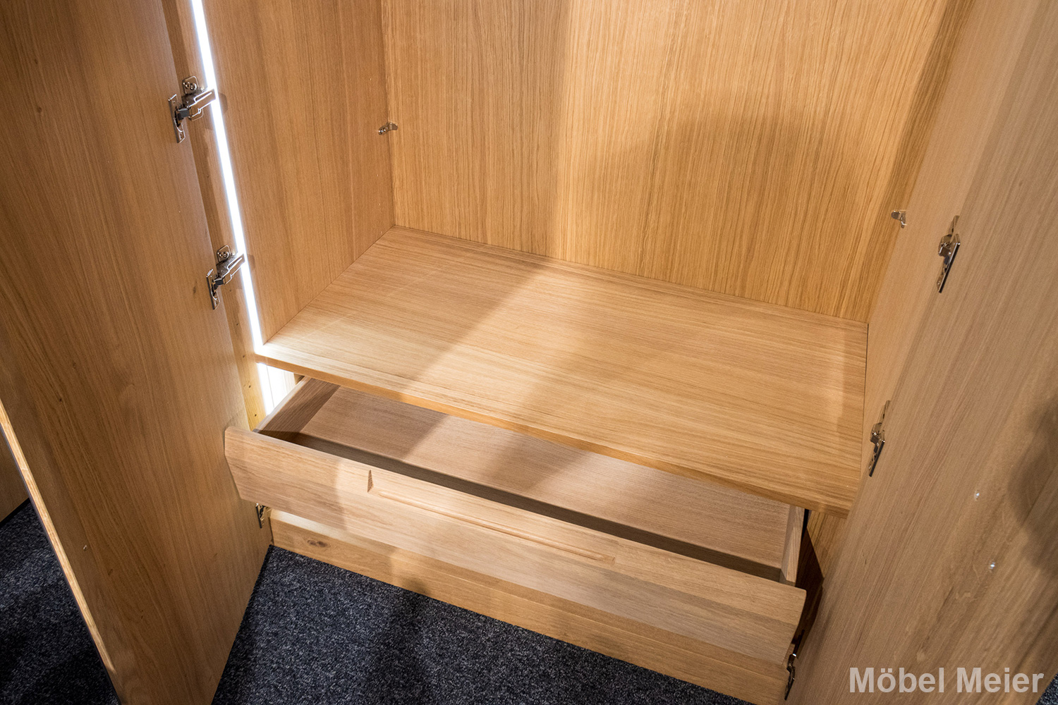 Entdecken Sie die Vielseitigkeit mit optionaler Korpusinnenbeleuchtung, die Ihre Kleidung stilvoll in Szene setzt. Zusätzliche Fachböden und Doppelinnenladen bieten flexible Aufbewahrungslösungen. Die robuste Handwerkskunst und der edle Materialmix zeichnen dieses Möbelprogramm aus.