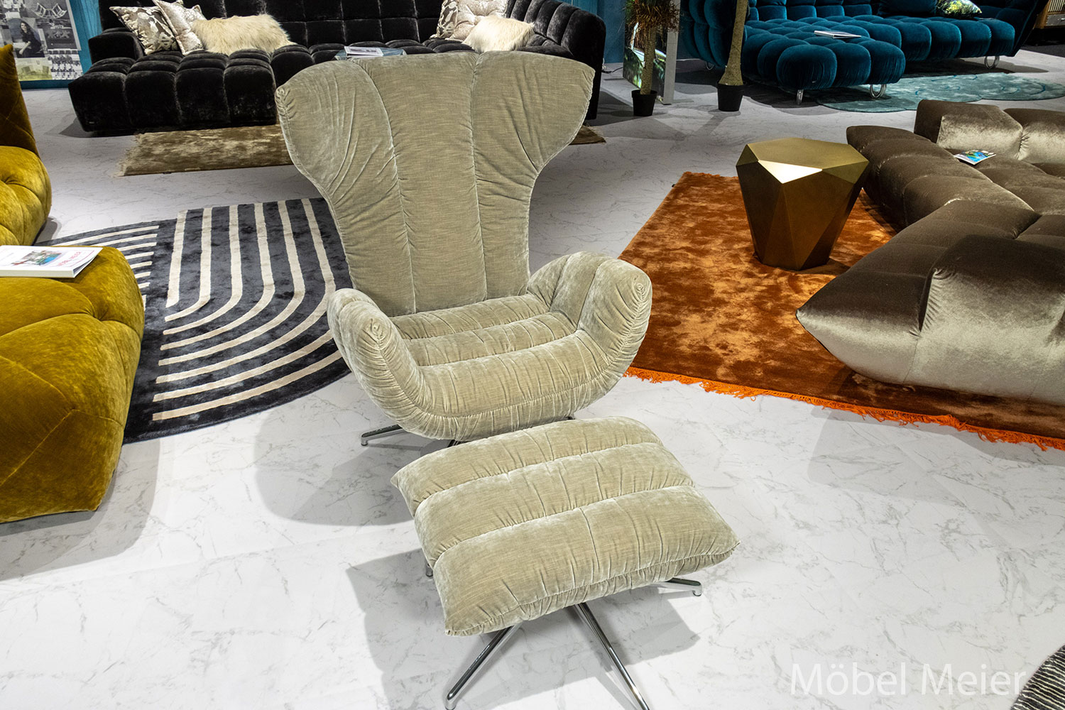 | 1x | Dreh -/ Wippsessel Bezug: 64 1985 Happy Velvet cashmere Fuss: 82 Aluminium-Drehkreuz poliert | A 156 | |